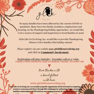 Girls Like Us Evolving, Inc. would like to give back to this holiday season. We will be providing Thanksgiving Dinner Baskets to five families this holiday season!