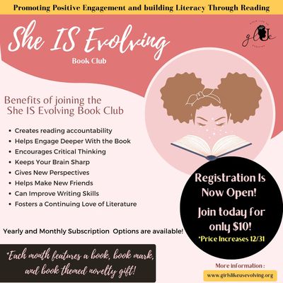 Girls Like Us Evolving, Inc. launched our She IS Evolving Book Club in 2021 and we are so excited about the participation from our young readers! 2023 will be no different. We are looking forward to pressing forward and continuing to promote positive engagement and building literacy through reading!